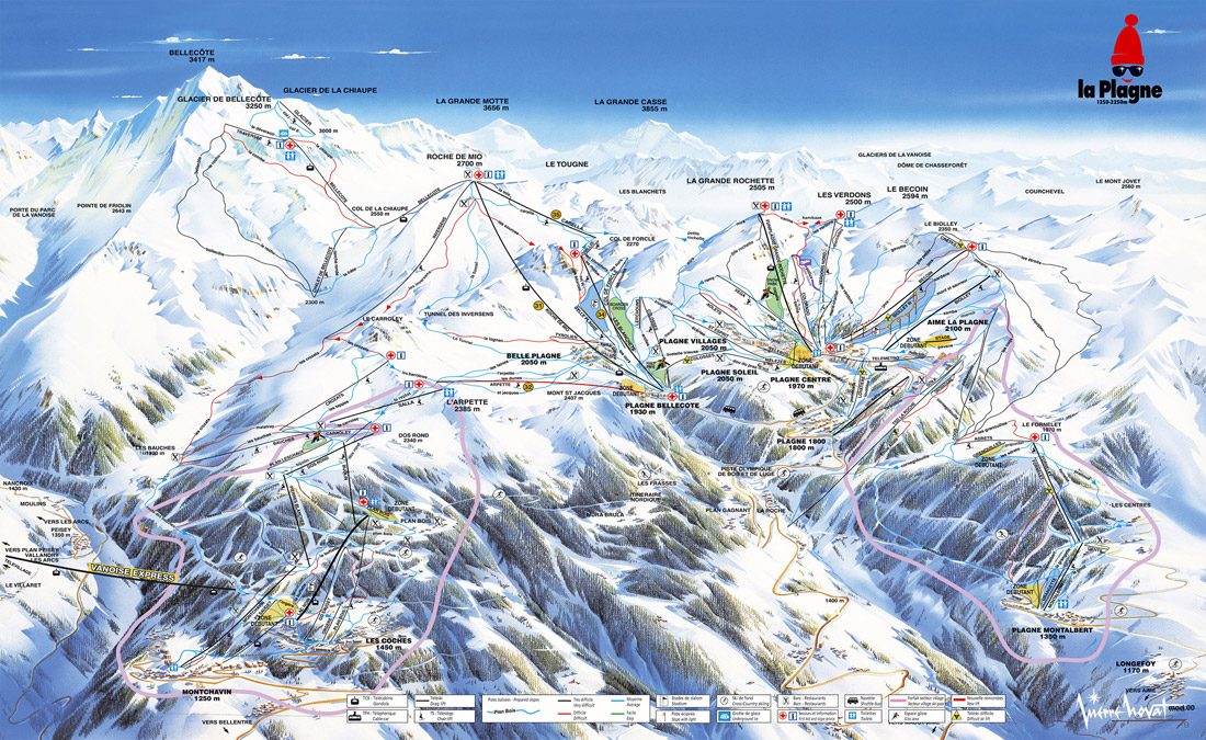 Зона катания непосредственно La Plagne - около 225 км маркированных трасс (10- черных, 34- красных, 79- синих, 11-зеленых), но недавно La Plagne, с помощью строительства подъемника Vanoise Express (200 местная кабина, 4 минуты в пути), был объединен с Les Arcs, и если приобрести пропуск на объединенную зону катания (Paradiski), то в вашем распоряжении будет 425 км маркированных трасс (29- черных, 66- красных, 132- синих, 12-зеленых). Перепад высот 1200-3250 метров. Весь район может быть поделен на семь взаимосвязанных секторов: Биолей (Biolley), Гран-Роше (Grande Rochette), Рош-де-Мио (Roche de Mio), Белькот-Гласье (Glacier de Bellecote), Моншавен (Montchavin), Монтальбер (Montalbert) и Шампани (Champany). Ла Плань — идеальное место для лыжников среднего уровня и для начинающих, здесь очень много "синих" и "красных" спусков. У профессионалов же выбор невелик: есть "черные" трассы, ведущие с ледника Белькот и спуски с Биолей, также — неплохая трасса от Гран-Роше к Шампани (однако из-за того, что склон южный, на ней может подвести снег) и трассы "Камикадзе" (Kamikaze) и "Харакири" (Hara-Kiri) в секторе Шампани. Для любителей фрирайда подойдут северный 100-метровый кулуар на высшей точке Белькот и южные склоны Рош-де-Мио. На базах Плань-Белькот и Бель-Плань оборудованы стадионы для слалома, могула и сноуборда.